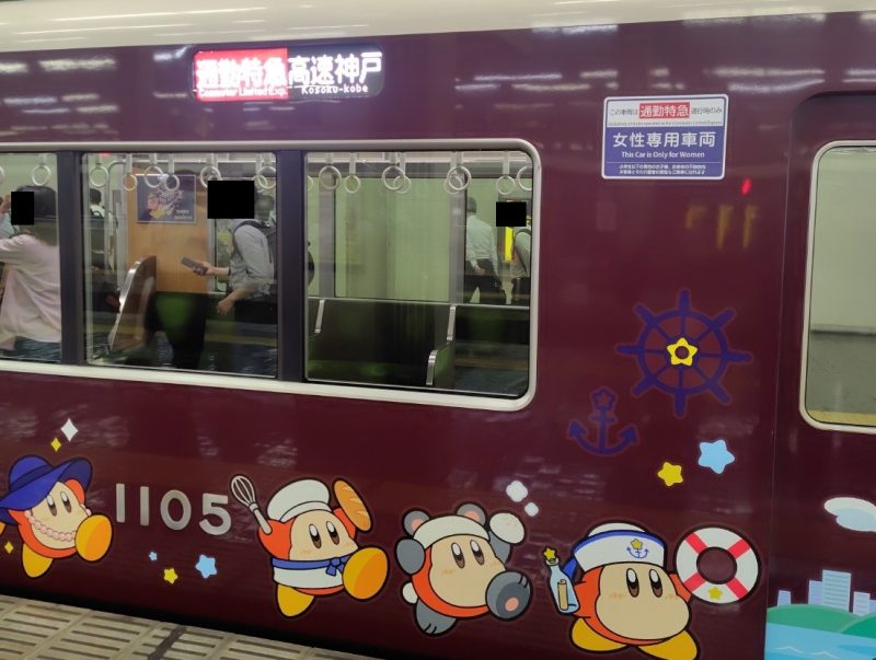 しばらくして駅構内にアナウンスが入り、列車がホームに入ってきた。7:13発の通勤特急は「星のカービィ」ラッピング車両である。