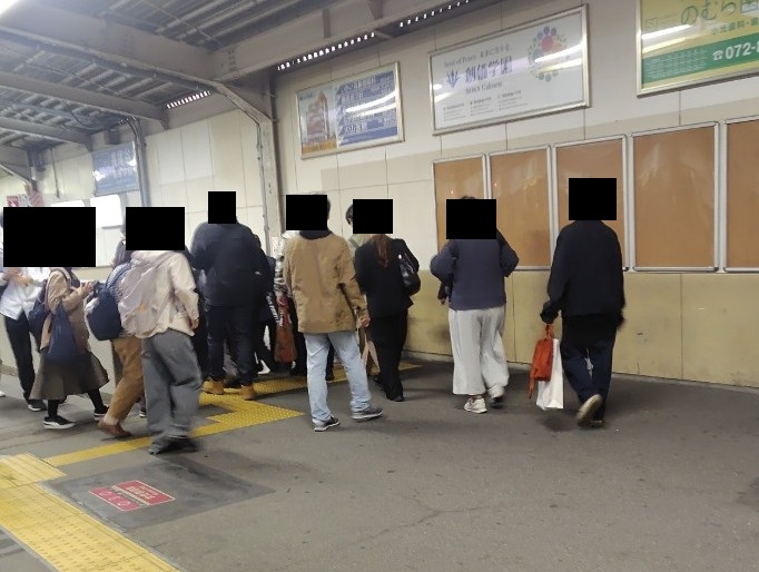 列車が遅れているせいかどうか分からないが、京橋駅の学研都市線ホームには多くの人が列車を待つため並んでホームを埋めていた。