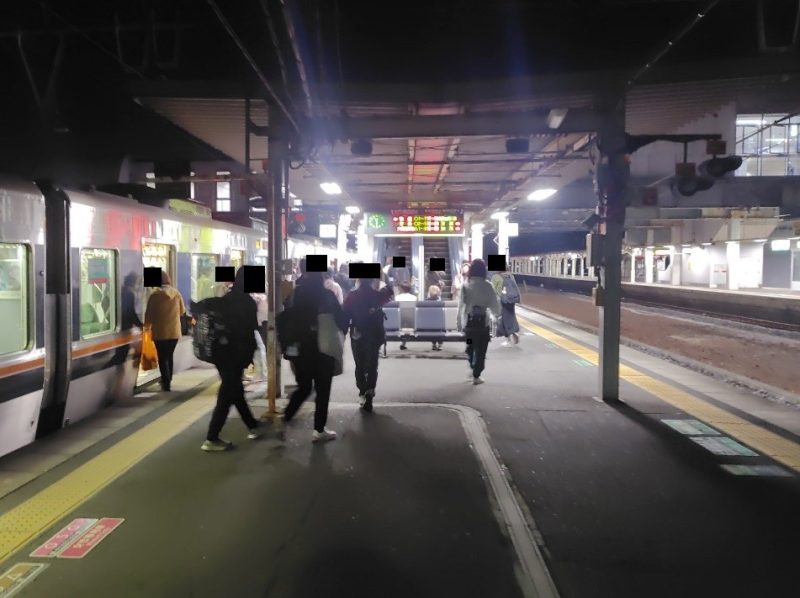 おおさか東線が次の加美駅手前で進行方向右手に分かれていき、私達の乗った列車は加美駅、平野駅、東部市場前駅と停車。いつしか車内はまた座席が埋まり、19:09頃に大阪環状線や阪和線等と接続する天王寺駅に到着、