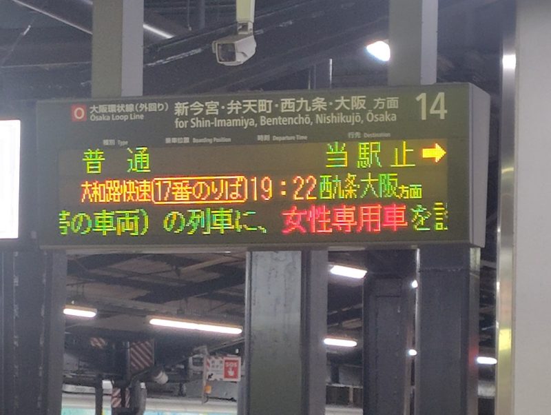 ホームの発車標の電光掲示板にはテロップで「ご案内●大阪環状線では、足元の乗車位置表示○印(銀色とオレンジの帯の車両)の列車に女性専用車を設けております。ご理解とご協力をいただき、ありがとうございます。」
