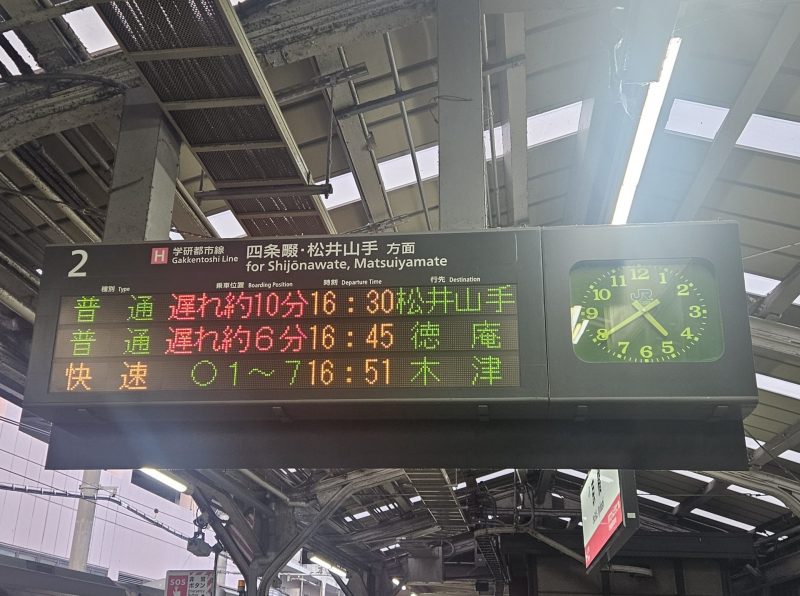 現時点ですでに3分遅れているが京橋駅で約3分停車して、結局約6分遅れの16:57に京橋駅を発車した。
