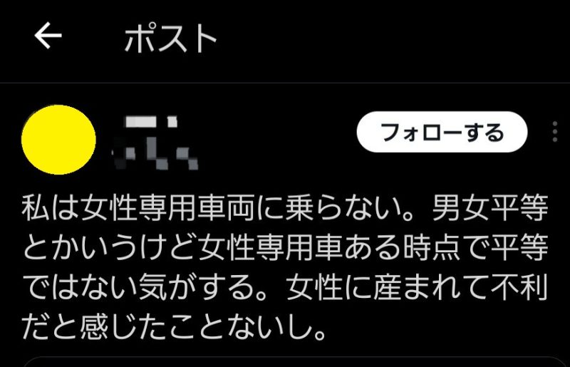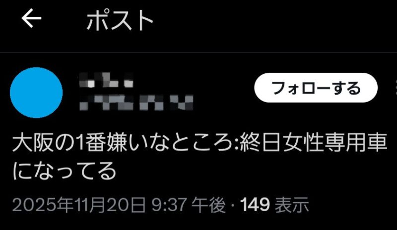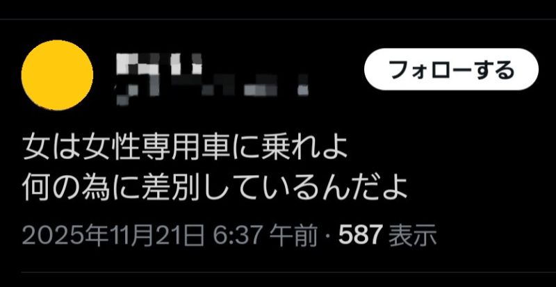 「ここは女性専用車両です」「日本人として恥ずかしい」 SNS投稿“3500いいね”が映す集団心理と都市交通の摩擦(Merkmal) - Yahoo!ニュース10月下旬、あるSNS投稿が静かな波紋を広げた。いいねは3500件を超え、コメント欄には500を超える意見が寄せられた(10月31日時点)。 投稿者は30代の日本人女性。数年間カナダに滞在して(現在はリンク切れ)
