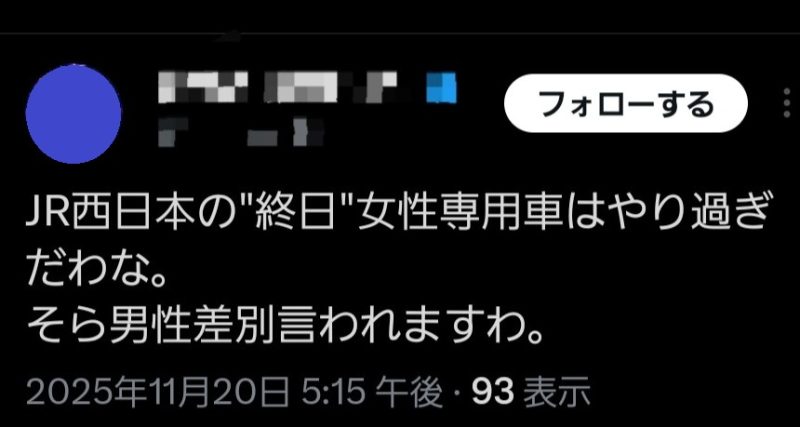 なお、今年(2025年)10月18日の土曜日に「なにわ淀川花火大会」が開催された日の夜にJR西日本線に乗っていた会員によると、その日の21時から大阪環状線や神戸線など一部路線では女性専用車の設定を解除する旨の車内放送があったとのことだが、そもそも普段の土曜休日ダイヤの日にまで設定するから鉄道係員にとっても乗客にとっても余計にややこしいことになる。