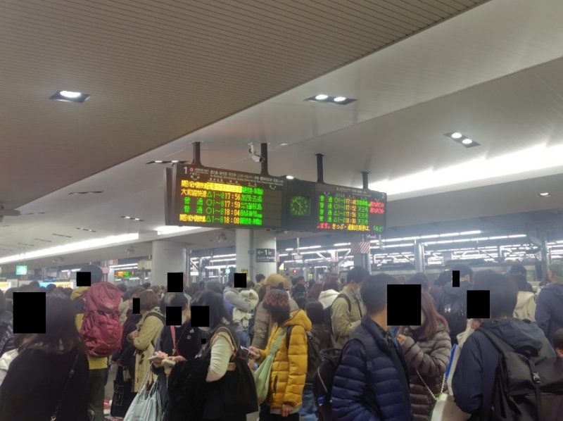 17:48頃に大阪駅に到着。私達と共に他の乗客も大量に下車し、ホームはみるみる人で一杯になった。
