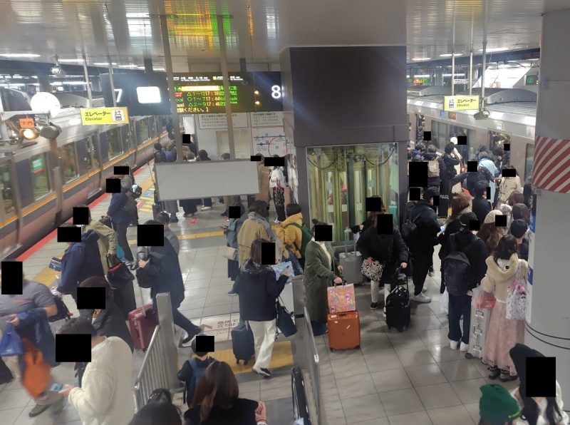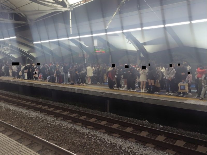 一方で反対側のホームはUSJ(ユニバーサルスタジオジャパン)からの帰りと思われる乗客でいっぱいになっており、非常に対照的であった。
