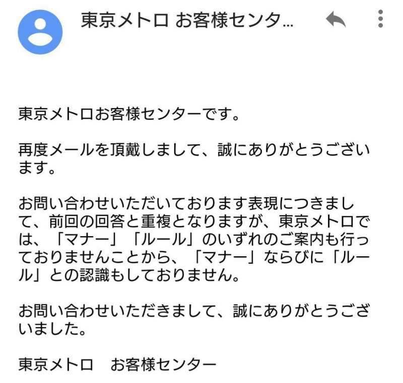 以下に示すのは女性専用車両についての東京メトロの回答ですが、同じ日本の鉄道事業者なのに、女性専用車両がマナーか否かについては近鉄と真逆のことを言っています。
